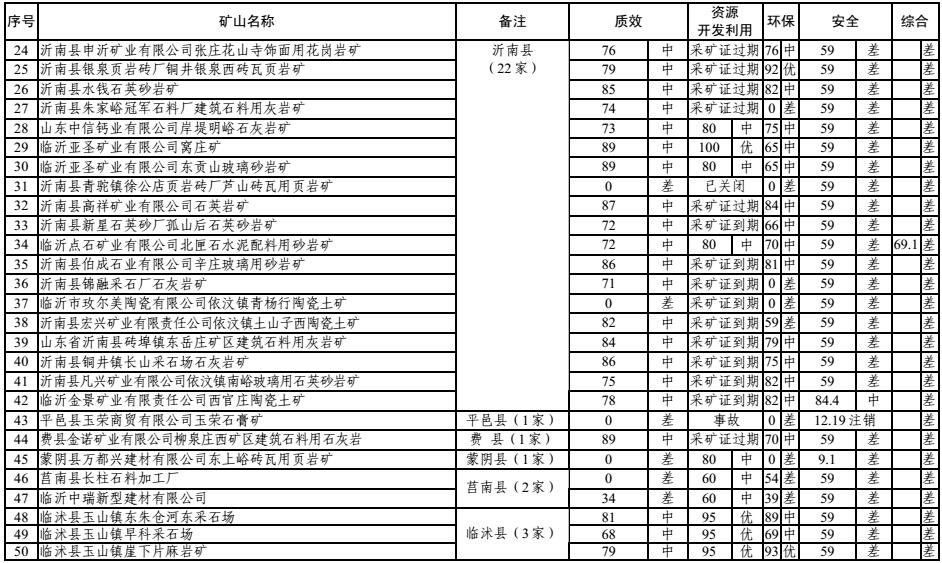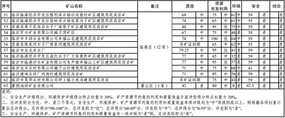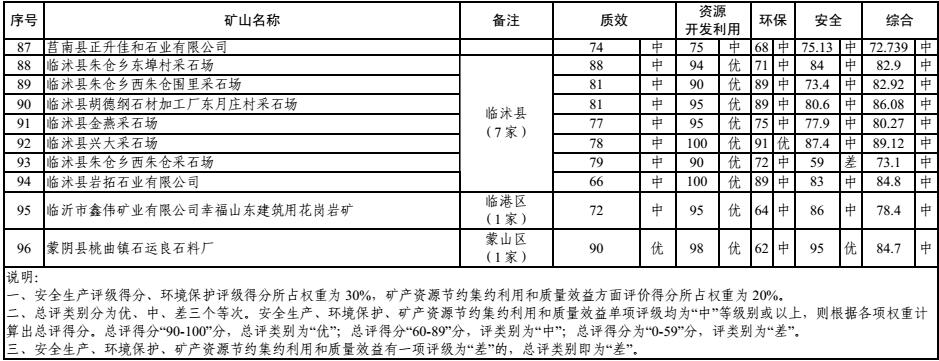 據了解,臨沂市礦山轉型辦組織市經信委、市國土資源局、市環保局、市安監局,對各縣區上報的質量效益、礦產資源開發利用、環境保護、安全生產單項評級初評結果進行了審查把關,并對各單項評級進行總評打分。其中,安全生產評級得分、環境保護評級得分所占權重為 30%,礦產資源節約集約利用和質量效益方面評價得分所占權重為 20%。總評類別分為優、中、差三個等次。總評得分“90-100”分,總評類別為“優”;總評得分“60-89”分,評類別為“中”;總評得分為“0-59”分,評類別為“差”。同時,安全生產、環境保護、礦產資源節約集約利用和質量效益有一項評級為“差”的,總評類別即為“差”。截至目前,臨沂市綜合評級共完成180 家,其中“優”21 家,“中”96 家,“差”63 家。