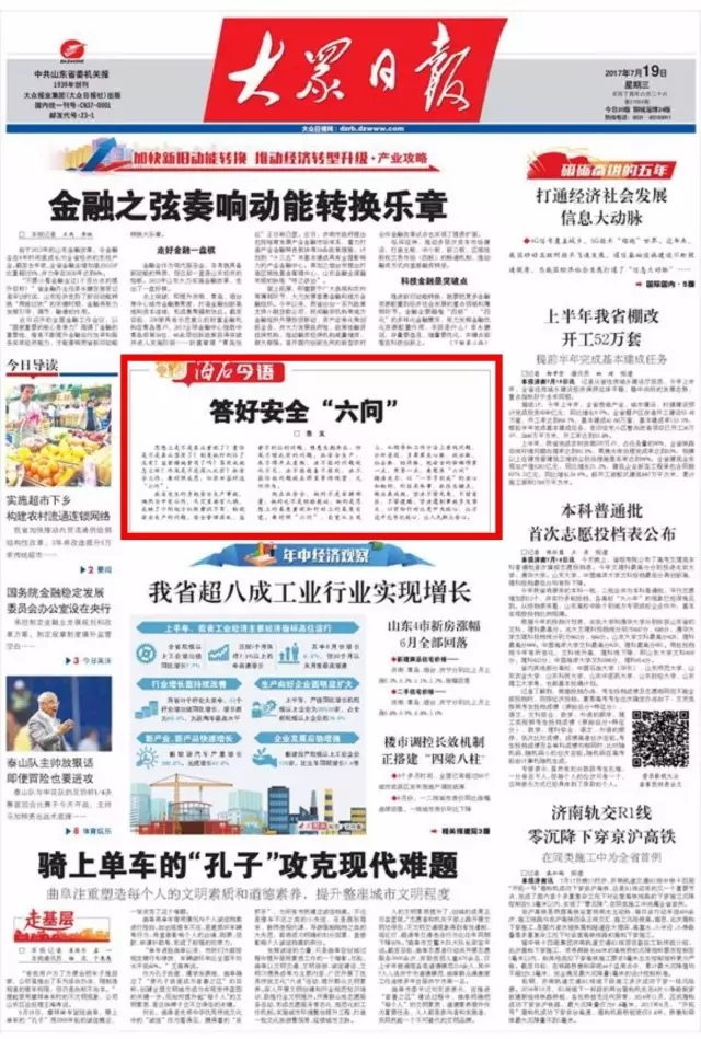 7月19日,大眾日報“海右今語”專欄刊發署名魯義的文章《答好安全“六問”》。