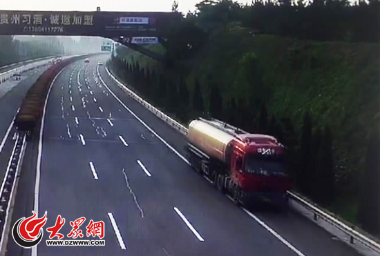 監控錄像顯示,該危化品運輸車在青蘭高速萊蕪段逆行