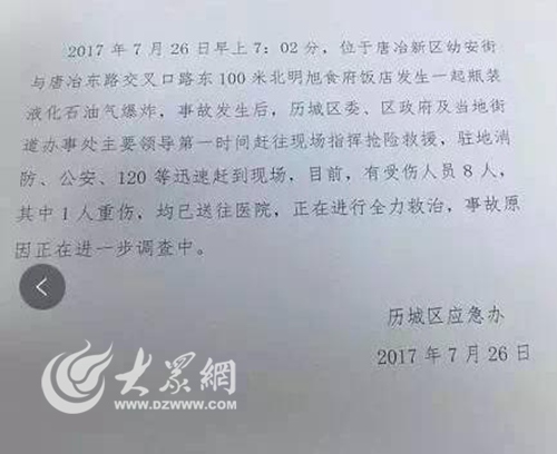 大眾網(wǎng)濟(jì)南7月26訊 今天上午11時(shí),據(jù)濟(jì)南市歷城區(qū)應(yīng)急辦相關(guān)負(fù)責(zé)人李主任介紹,今晨7時(shí)許,位于濟(jì)南唐冶新區(qū)幼安街與唐冶東路交叉路口東100米北明旭食府飯店發(fā)生一起瓶裝液化石油氣爆炸,市、區(qū)有關(guān)領(lǐng)導(dǎo),消防、公安和120等救援人員第一時(shí)間趕到現(xiàn)場(chǎng),目前現(xiàn)場(chǎng)發(fā)現(xiàn)有8人受傷,均已送往醫(yī)院救治。本次事故疑似煤氣罐泄露引發(fā),具體的爆炸原因有關(guān)部門正在調(diào)查。另?yè)?jù)現(xiàn)場(chǎng)目擊者介紹,事發(fā)地位于濟(jì)南東部銀豐唐郡小區(qū)一棟樓的底層沿街商鋪。(大眾網(wǎng)-山東24小時(shí)客戶端記者 王磊)