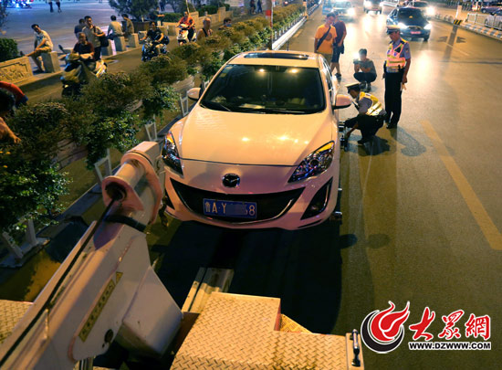 昨晚,濟南交警市中大隊對違法停車進行拖移