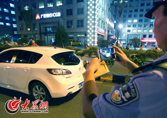 市中區交警在萬達廣場附近對違停車輛進行現場取證處罰