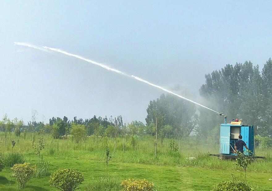 記者注意到,該渣土場降塵設備齊全,門口的揚塵監測系統正常運轉,車輛進出工地經洗車平臺沖洗后,還需經過一旁的U形水池進行二次沖洗,確保車輛不帶泥上路。走入渣土場內部,兩臺遠程智能揚塵治理系統噴射出高高的水流,掃射半徑達60米,可謂是降塵“神器”。不遠處,幾名工人正在不間斷巡查,發現裸露地面立即覆蓋。