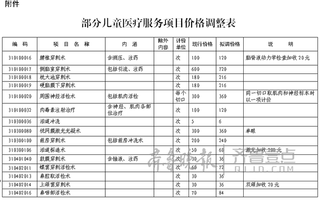 記者從煙臺市物價部門了解到,根據(jù)《關于印發(fā)〈貫徹國衛(wèi)醫(yī)發(fā)〔2016〕21號文件加強兒童醫(yī)療衛(wèi)生服務改革與發(fā)展工作方案〉的通知》(魯衛(wèi)醫(yī)字〔2016〕31號)的要求,煙臺市調整部分兒童醫(yī)療服務價格。6歲(含)以下兒童手術價格,在現(xiàn)行價格基礎上提高20%。6歲(含)以下兒童一般治療操作、有創(chuàng)活檢、探查等項目價格,在現(xiàn)行價格基礎上加收20%。