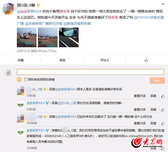 今天午后,濟南突降暴雨,大雨持續了一個多小時,市區多處路段積水,不少行人、汽車都被堵在了半路上。今天下午15時31分,網友@劉小仙_C姐 發微博稱:“你找個備用停車場,找個好點的,結果一場大雨全陷進去了,一輛一輛推出來的,看我車上這泥巴。明知道今天濟南開業,車多,為啥不提前準備好了停車場呢。”并艾特了宜家官微@宜家家居IKEA,還配發了3張濟南宜家臨時停車場的圖片。從圖上可以看到,雨后的停車場一片泥濘,車輛開出比較困難,還有數十輛汽車仍然停在泥里。