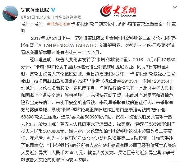 大眾網(wǎng)8月22日濟南訊記者從寧波海事法院官方微博獲悉,2017年8月21日上午,寧波海事法院公開宣判“卡塔利娜”輪二副艾倫 門多薩 塔布雷(ALLAN MENDOZA TABLATE)交通肇事案,對被告人艾倫 門多薩 塔布雷以交通肇事罪判處有期徒刑三年六個月。