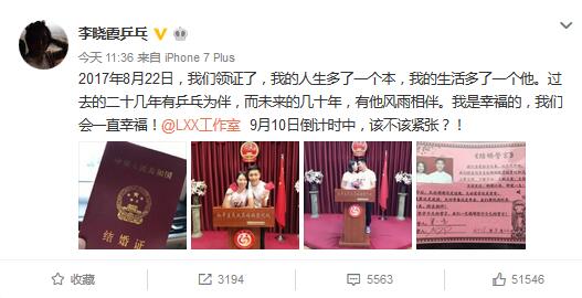 今天上午11:36,乒乓球奧運冠軍李曉霞@李曉霞乒乓突然在微博上宣布結婚喜訊:“2017年8月22日,我們領證了,我的人生多了一個本,我的生活多了一個他!蓖瑫r曬出的還有4張照片,包括結婚證、結婚誓言以及夫妻倆在和平區民政局婚姻登記處的幸福合影。照片中,這對新婚夫婦深情對視,滿臉幸福笑容。李曉霞在微博上說:“過去的二十幾年有乒乓為伴,而未來的幾十年,有他風雨相伴。我是幸福的,我們會一直幸福!”