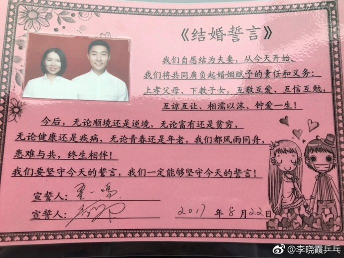 李曉霞曬出的結婚照和結婚誓言。