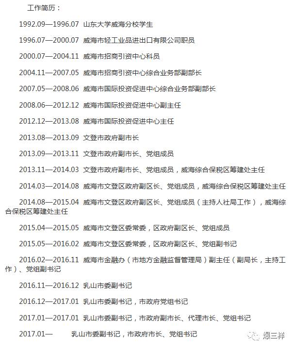 翻閱乳山市政府官網(wǎng)的領(lǐng)導(dǎo)簡(jiǎn)歷,爆三樣發(fā)現(xiàn),宮本杲大學(xué)畢業(yè)后,曾先后在威海市輕工業(yè)品進(jìn)出口有限公司、威海市招商引資中心和威海市國(guó)際投資促進(jìn)中心任職。2013年08月,宮本杲從威海市國(guó)際投資促進(jìn)中心主任調(diào)任文登市政府副市長(zhǎng),同年11月兼任威海綜合保稅區(qū)籌建處主任。2016年2月任威海市金融辦副主任,同年11月調(diào)任乳山市委副書(shū)記。今年1月,任乳山市委副書(shū)記、市長(zhǎng)。