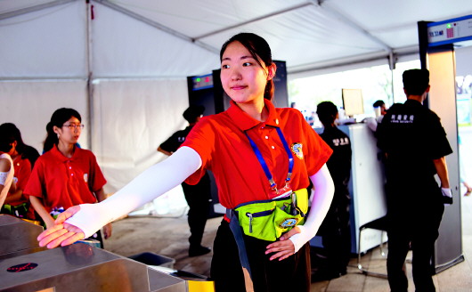 由于今年新增加了證件制作、實景秀觀眾席秩序維護等新崗位,不少志愿者都要身兼多職。位于金沙灘啤酒城中央舞臺的實景秀檢票口,志愿者在檢票工作完成后,還要進入觀眾席引導游客入席、維護觀眾席秩序等工作。