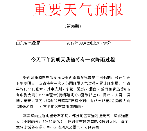 大眾網濟南8月23日訊 今天上午,大眾網記者從山東省氣象局獲悉,受西風槽和副熱帶高壓邊緣西南暖濕氣流的共同影響,預計今天下午到明天,我省將有一次大范圍降雨天氣過程。累計降水量:全省平均10~15毫米,其中濱州、東營、濰坊、煙臺、威海和青島等6市有中到大雨(15~30毫米)局部暴雨(50毫米以上),德州、濟南、淄博、泰安、萊蕪、臨沂和日照等7市有小到中雨(5~15毫米)局部大雨(25毫米以上),其他地區有雷雨或陣雨。