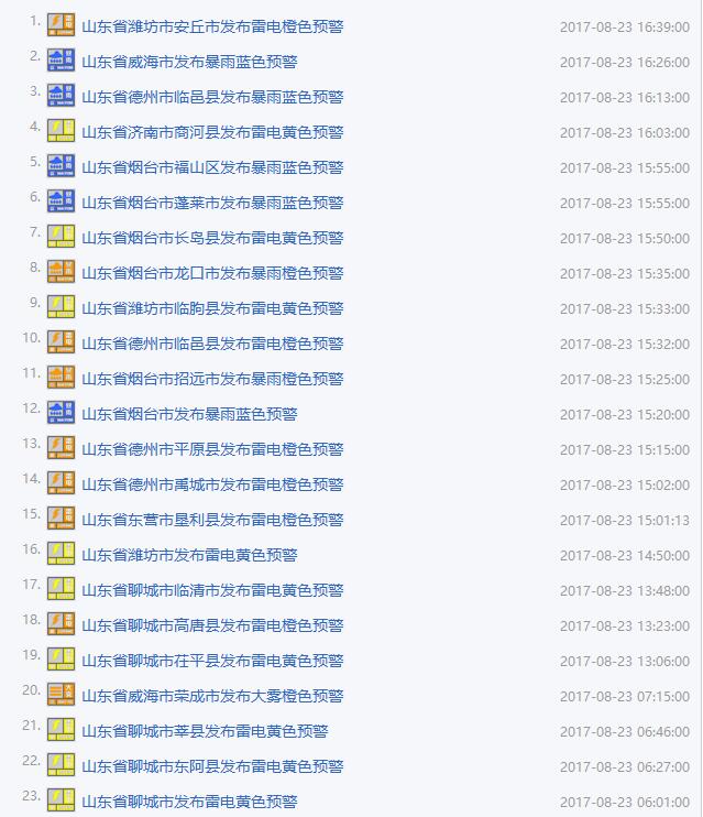 省內多個地市發布雷電或暴雨預警。截至發稿時,威海市、煙臺市發布暴雨藍色預警,濰坊市、聊城市發布雷電黃色預警。