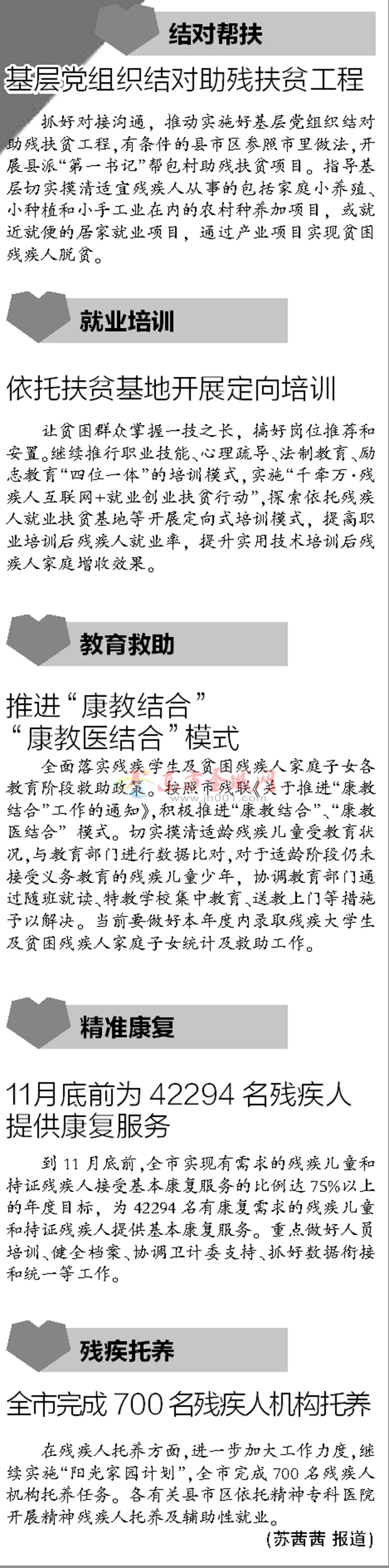 貧困殘疾人致貧的原因復雜,既有因缺少資金、生產資料等要素的經濟貧乏,還有因殘疾而承擔的醫療康復支出壓力,更有因身心障礙、缺少康復機會、普遍受教育水平低、受歧視等社會文化因素導致的特殊困難。據市殘聯相關負責人介紹,市殘聯下一步將多舉措扎實做好殘疾人精準扶貧工作,推動新符合條件的殘疾人全部納入建檔立卡范圍,確保殘疾人精準識別無一遺漏。