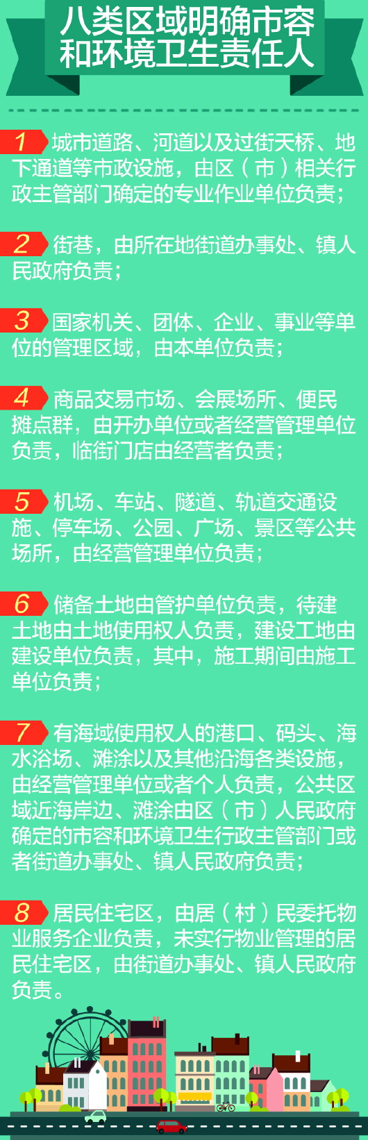 條例(草案修改一稿)對市容和環境衛生責任區、責任人進行了詳細的規定,并按8大類別予以明確。除規定區域外,其他建(構)筑物或者設施、場所的產權人為市容和環境衛生責任區的責任人。市容和環境衛生責任人應當保持責任區內市容和環境衛生整潔,無暴露垃圾、糞便、污水和引發病媒生物孳生的其他污染源,按照規定掃雪除冰。責任人未履行市容和環境衛生責任的,責令改正;拒不改正的,對個人處一百元以上二百元以下的罰款,對單位處五百元以上五千元以下的罰款或者建議其上級主管部門對直接負責的主管人員給予處理。