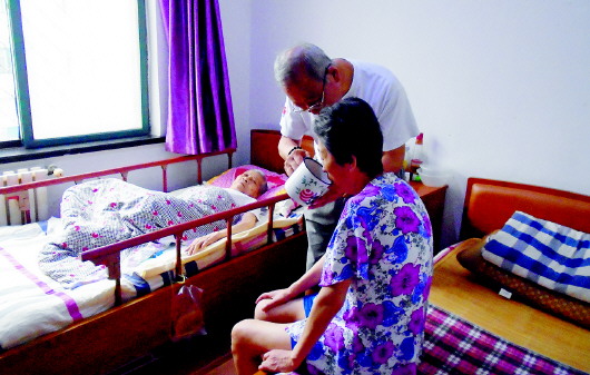 在市南區(qū)惠康老年公寓,曲春光老人正在給失智的老伴喂水。