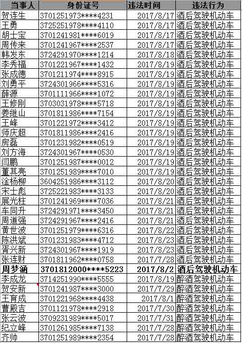 濟南交警支隊8月25日公布的近期酒駕名單