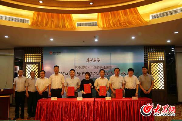 東營(yíng)市供銷社、蘇寧云商集團(tuán)、黃河口大閘蟹有限公司代表、大眾海藍(lán)信息科技有限公司代表簽署戰(zhàn)略合作簽約儀式。