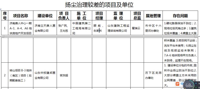 對揚塵治理較差,整改不及時或屢改屢犯的濟南唐人中心一期A-3、A-4、A6地塊房地產開發項目等7個項目的參建單位和屬地管理部門,予以全市通報批評,責令限期整改,計入不良行為記錄,納入誠信評價體系,并將其違規行為移交相關執法部門進行處罰。