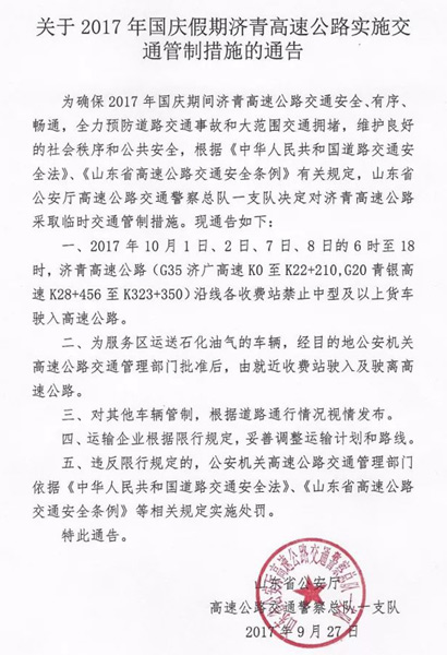 • 國慶假期濟青高速北線交通管制 分時段禁行大中型貨車