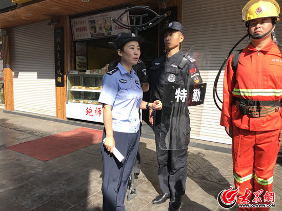 28日上午,大眾網記者在寬厚里看到,負責維護商區治安的安保團隊已經上崗。兩名警務人員分別手拿防暴鋼叉、防暴盾牌,一名消防人員裝備著目前最先進的細水霧滅火槍,“防暴三人組”看起來英姿颯爽。據介紹,這種滅火槍噴射時可以產生一頓左右的壓力,既能用來滅火,又可以在關鍵時刻阻止違法嫌疑人。記者了解到,國慶假期期間,像這樣的“防暴三人組”將堅守崗位,每天進行六到八次巡邏,全力保障景區商區安全。