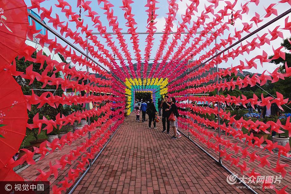 2017年10月2日,青島香博園,迎風飛舞的風車成為一道靚麗的風景。