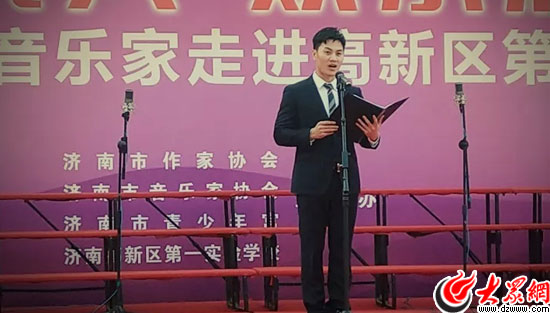 濟南市音樂家協會主席王信義:“歷下此亭古,濟南名士多”是我們濟南歷代文人輩出的真實寫照。如今,生活在我們身邊的作家,音樂家,秉承齊魯遺風,展現當代風采,創造了許多好作品,并愿意無私的奉獻給青少年朋友。今天這樣一個活動,為學校的師生們搭建了一個和作家、音樂家面對面交流的平臺,希望同學們在學好文化知識的同時,用好的文學和藝術作品豐富課余生活,豐富情感世界,為美好的人生旅途奠定良好的基礎。