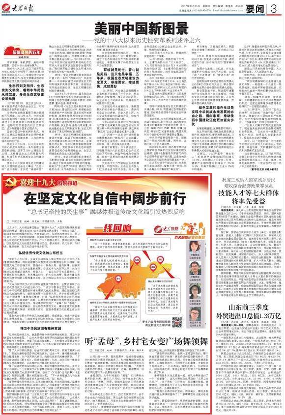 10月14日,大眾報業集團推出“喜迎十九大”大型系列融媒體報道《殷切的希望 最實的擔當·總書記牽掛的民生事》“傳統文化篇”,引起讀者和網友的強烈反響。“大眾日報傳統文化的主題報道整體氣勢恢宏,全景式展現了山東弘揚優秀傳統文化的擔當和作為。[詳細]