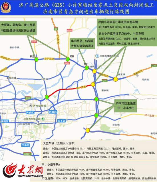 大眾網(wǎng)濟(jì)南11月1日訊 根據(jù)濟(jì)青高速擴(kuò)建施工需要,濟(jì)廣高速(G35)小許家樞紐至零點(diǎn)立交段將進(jìn)行雙向封閉施工,工期自11月7日0點(diǎn)至2019年6月30日24點(diǎn),期間過(guò)往車(chē)輛需繞行。大型車(chē)可經(jīng)唐王樞紐北行至青銀高速(G20),經(jīng)遙墻、崔寨、靳家進(jìn)出濟(jì)南市;小型車(chē)既可沿上述線路行駛,也可南行至郭店互通、邢村互通進(jìn)出濟(jì)南市。