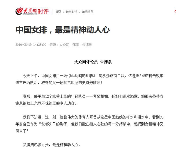 大眾網評論《中國女排,最是精神動人心》 獲網絡評論類二等獎