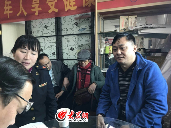 11月21日上午,尹訓(xùn)銀(右一)幫助濟南市一位市民調(diào)解消費糾紛