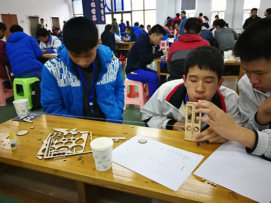 記者了解到,本次邀請賽共歷時兩天,主要內容為動手制作比賽,參賽隊員利用主辦方所提供的特定材料,現場動手制作作品并進行比賽。在今天下午的制作風車比賽中,大賽組委會要求參賽學生,在兩個半小時時間里,要根據大賽提供的兩塊木板模型,制作出一個風車。根據比賽要求,最后學生提交的作品,需要能夠吹動風車后,拉動裝進沙子的紙杯行走。距離與紙杯重量的乘積越大,成績越高。