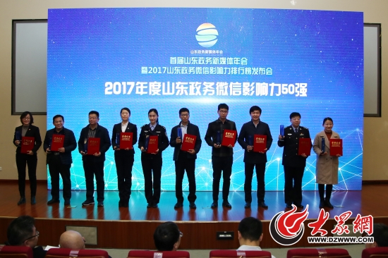 大眾網濟南訊 1月25日下午,“新時代·新政務·新傳播”2017山東政務新媒體年會在大眾傳媒大廈開幕,山東省內100余家政務新媒體負責人齊聚一堂,共同總結山東政務新媒體的發展成果,共享政務新媒體發展方略,攜手展望山東政務新媒體發展前景。年會發布了2017山東政務新媒體影響力年度排行榜,山東省網信辦副主任董志強、山東省人民政府辦公廳政府信息與政務公開處處長鄭耀武、山東大學新聞學院常務副院長劉明洋、山東省互聯網傳媒集團總經理林忠禮等出席年會并對獲獎者進行頒獎。