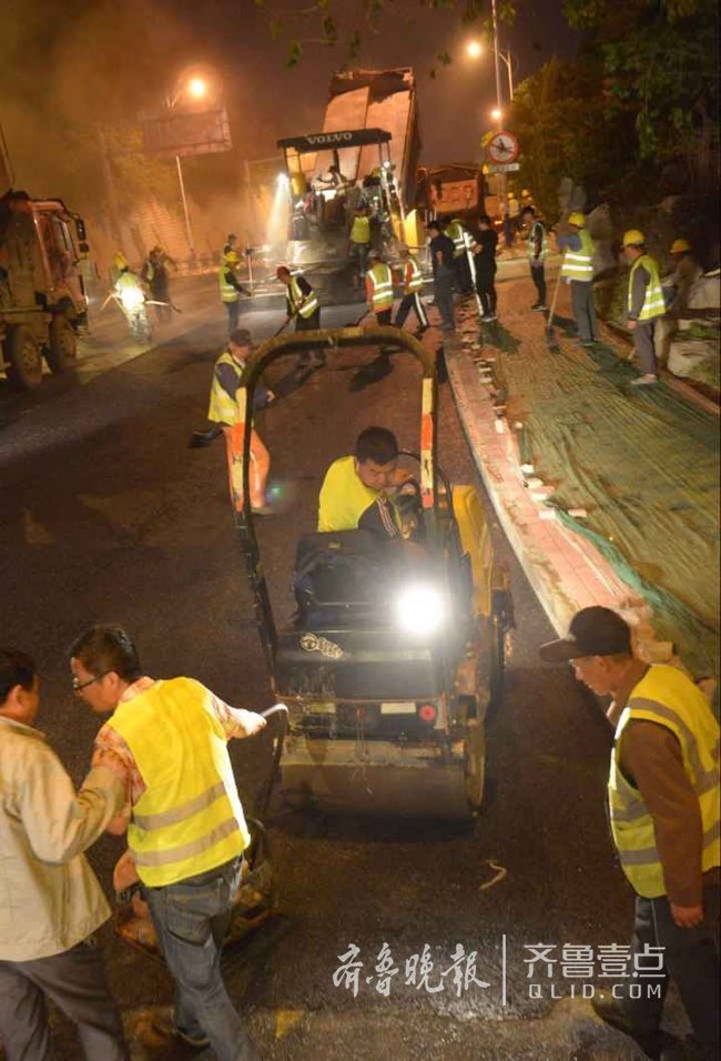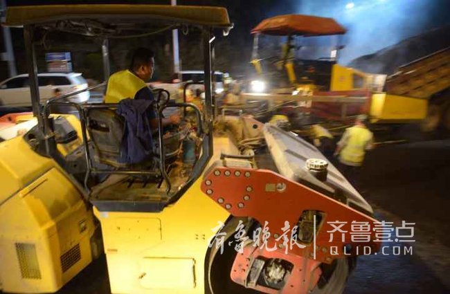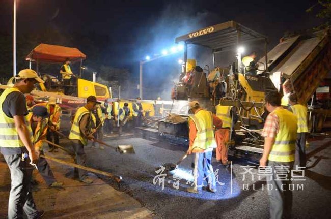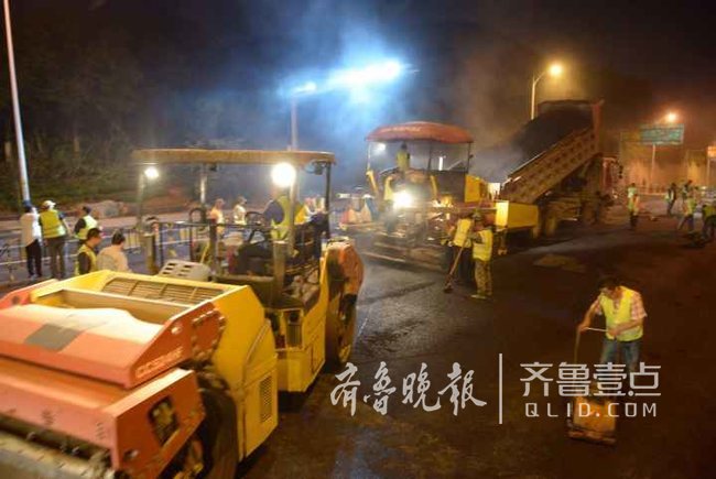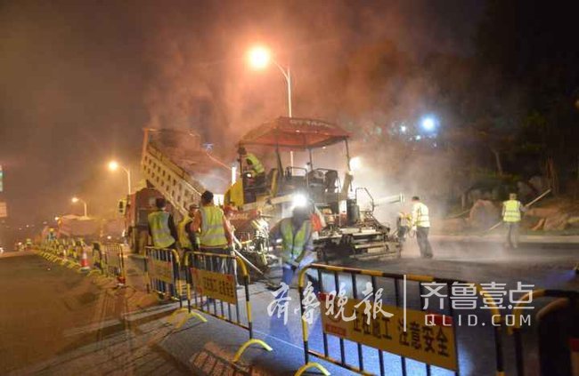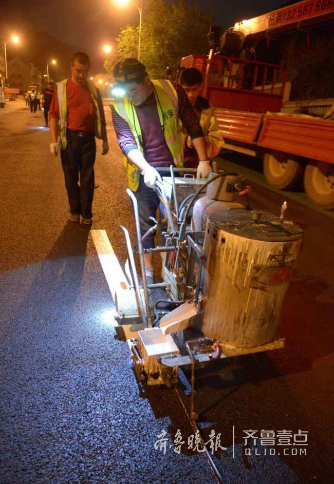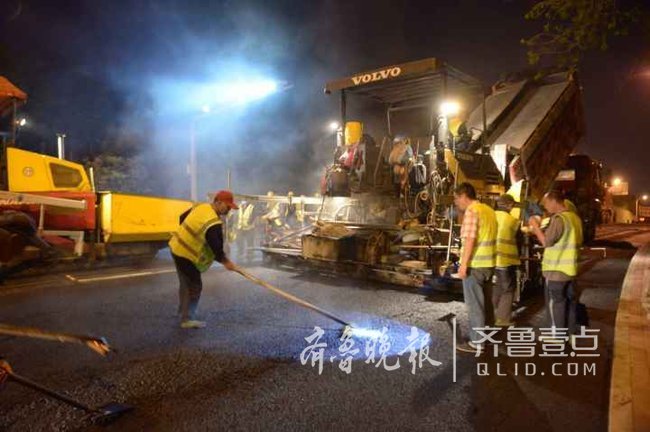 道路北半幅連夜攤鋪瀝青,南半幅連夜劃線。