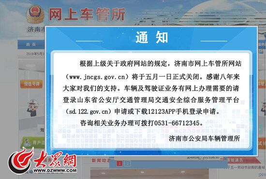 大眾網(wǎng)濟(jì)南5月3日訊 今天晚上,濟(jì)南市交警支隊車管所發(fā)布消息稱,根據(jù)上級優(yōu)化政府網(wǎng)站職能的統(tǒng)一規(guī)定,已將“濟(jì)南網(wǎng)上車管所”網(wǎng)站(jncgs.gov.cn)關(guān)閉。該網(wǎng)站關(guān)閉前,所有網(wǎng)上業(yè)務(wù)均已轉(zhuǎn)移至省交管局網(wǎng)站和12123手機(jī)APP,不會影響正常業(yè)務(wù)辦理。市民可登錄山東省公安廳交通管理局交通安全綜合服務(wù)管理平臺(sd.122.gov.cn),或下載12123手機(jī)APP來辦理違法查詢及處理、考試預(yù)約、預(yù)選機(jī)動車號牌、補(bǔ)換領(lǐng)牌證、核發(fā)臨牌等業(yè)務(wù)。此外,市民咨詢問題仍可撥打濟(jì)南市車管所服務(wù)電話0531-66712345。(大眾網(wǎng)-山東24小時記者 賀輝)