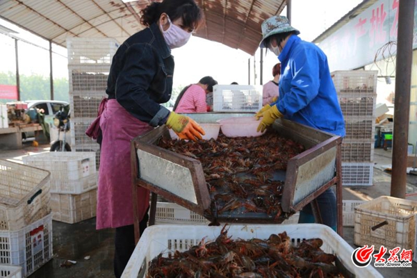 在利民管區(qū)沈運喜水產集中收購點。記者看到,80后時尚的趙小伙開著自家商務車前來送小龍蝦。這個收購站的老板顧不上跟記者搭話,一番驗貨稱重交易后,笑哈哈地拿著一只小龍蝦告訴記者,你瞧這鰓花雪白透亮的,說明水質好;你看這肚皮圓肥碩大,說明品質好,你再用手在筐里來回一劃,個個活蹦亂跳,說明體質健壯。我們微山湖的小龍蝦發(fā)往外地,都是100斤一包,外地小龍蝦都是40或50斤一包,內行人不看牌子,一看包裝就知道是我們微山湖的。因為微山湖的小龍蝦耐擠壓,成活率高,價格當然要比外地的小龍蝦要貴1-2元一斤,微山湖小龍蝦在全國十分搶手,很受客戶歡迎。我們的小龍蝦都銷往北京、上海、南京,就我這個收購站,旺季一天也往外走個五千斤。記者發(fā)現(xiàn),前來送小龍蝦的漁民有開著小卡車的,有也有開著面包車來的,送貨收送一律都是現(xiàn)金結賬,漁民點著鈔票樂的個個合不上嘴。