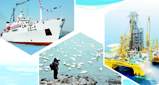 左圖:“大洋一號”科考船返回青島。(□薄克國 報道) 中圖:萬只天鵝在威海越冬棲息。(□新華社發) 右圖:煙臺企業交付的“藍鯨1號”海上鉆井平臺。(□新華社發)