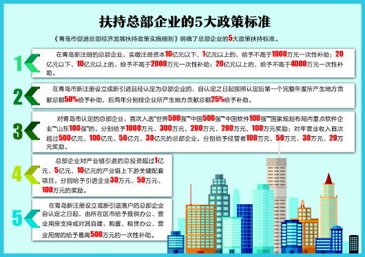 《青島市促進總部經濟發展扶持政策實施細則》明確了總部型企業的政策扶持標準、兌現流程、管理要求等事項,是去年出臺的《關于青島市實施現代產業精準招商政策措施》文件中對島城總部企業的具體扶持政策的落實。