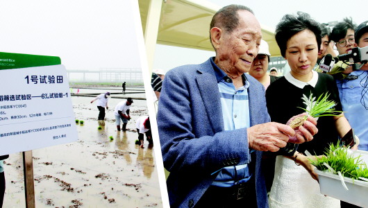 □記者 張曉帆 報(bào)道 左圖:工作人員在青島市城陽區(qū)濱海鹽堿地稻作改良示范基地插秧。右圖:插秧現(xiàn)場(chǎng),袁隆平親手篩選“海水稻”秧苗。