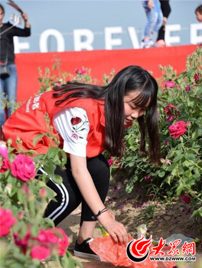 有一群來自定陶區黃店鎮中學的團員學生們,他們在老師的帶領下,身穿紅馬甲,頭頂太陽,自發走進玫瑰園,在各個道路上、玫瑰花叢里,撿拾廢塑料袋、煙蒂、廢紙,感動著前來游玩的每名游客,不自覺地為孩子們點贊,一位路過的游客豎著大拇指夸獎:"有了你們,玫瑰園更美麗。"