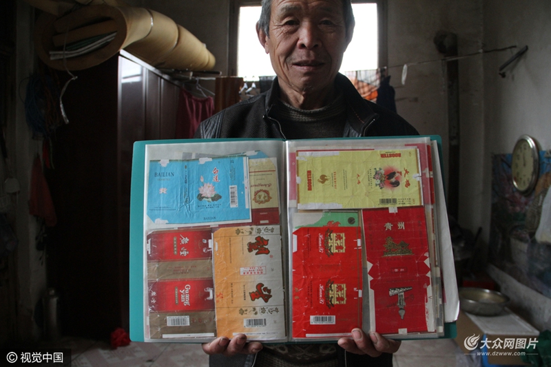 2017年3月23日,在山東濟南黨家街道棗林村,71歲村名王司柱老人在家里展示自己藏在家中的近萬張煙盒。老人稱自己,從小就開始收集煙盒,已經堅持有50余年了,當時收集煙盒純屬于業余愛好,自己并不喜歡抽煙,只是覺得好玩,也喜歡撿這些小東西,50余年一直堅持撿煙盒,如今家中藏有從每個年代不同時期的煙盒數萬張。