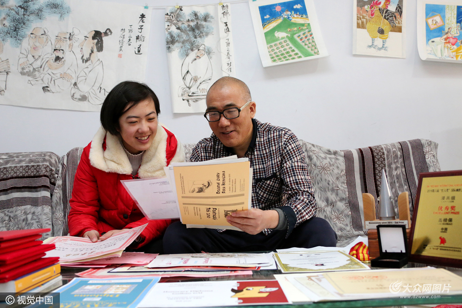 2017年03月27日,山東省棗莊市,今年46歲的蓋桂保是山東省棗莊市一名下崗職工,為了生存他四處漂泊打工,但從小就喜歡的漫畫藝術卻一直沒有放棄。外出打工休息時,他總愛在地上用樹枝作筆畫幾下,回到家里即使再勞累也要拿出紙筆畫上一陣子。他從2009年開始向國內外的漫畫大賽投稿,迄今為止創作的漫畫作品已有118次入選國際漫畫大賽,先后在國內外獲獎174次,其中17次獲國際大獎,并有3000多件漫畫作品在《諷刺與幽默》、《工人日報》、《幽默與笑話》等全國多家報刊上發表。