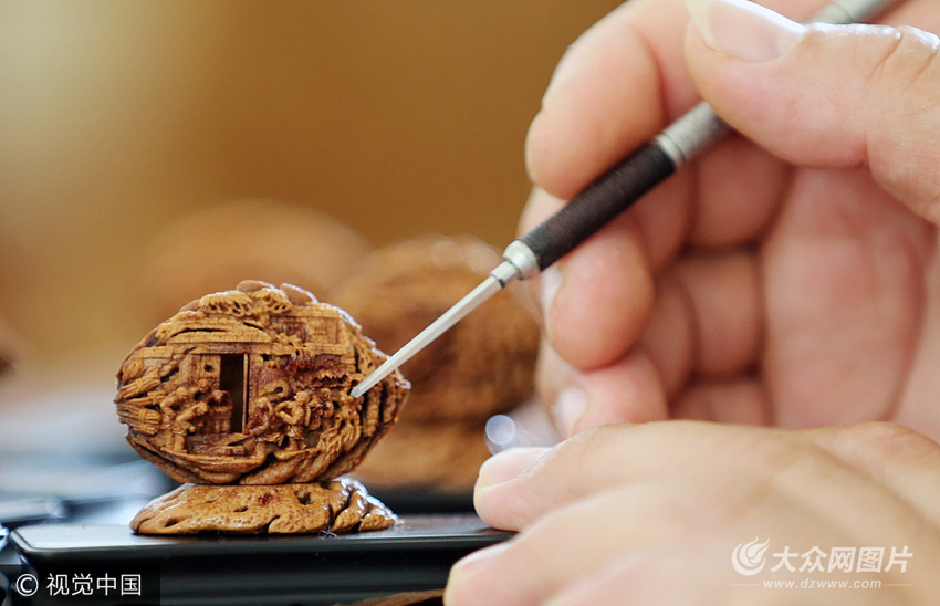 5月30日,濰坊青年核雕師田洪波正在創作《憶童年》核雕作品。日前,濰坊青年核雕師田洪波歷時三年多時間創作的《憶童年》核雕作品亮相,此核雕作品共十二件,采用立體圓雕、浮雕、鏤空相結合,丟沙包、斗蟋蟀、玩彈球、捉迷藏等70、80年代兒時的游戲栩栩如生的在核雕作品上展示,充分體現了時代感,喚起了人們對兒時的記憶。