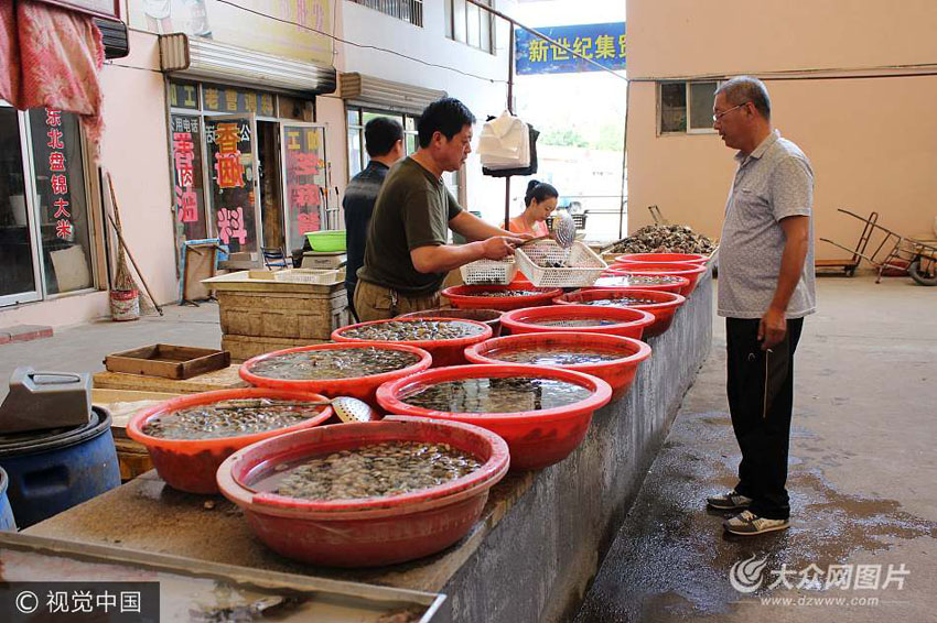 6月7日,在榮成市新世紀集貿市場,市民在購買海鮮。
