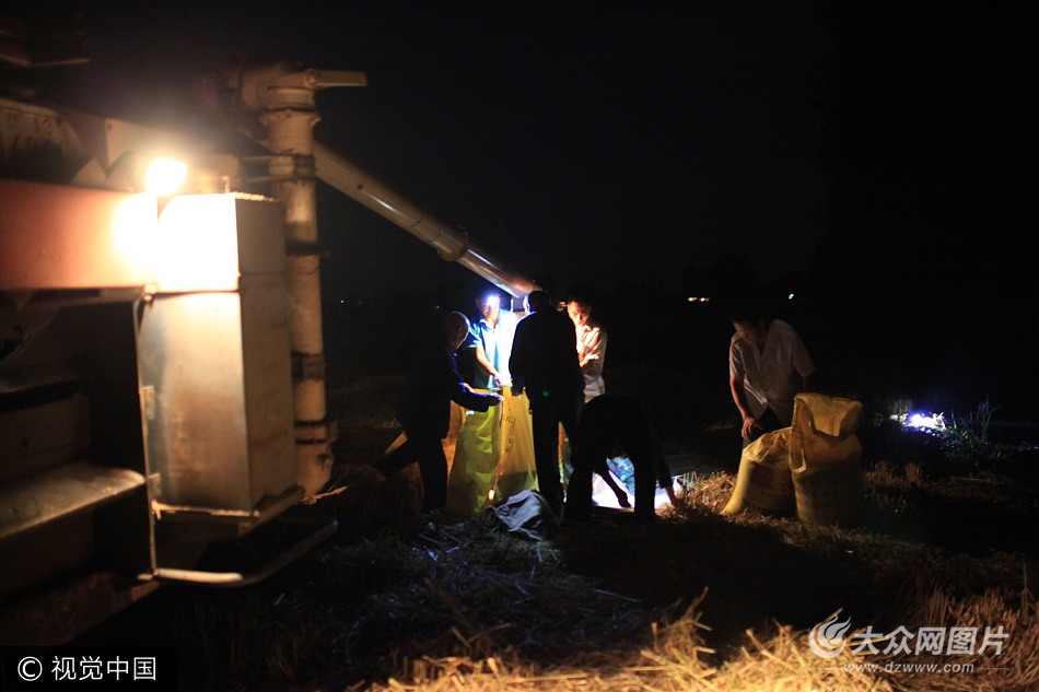 2017年6月8日,在山東省平邑縣地方鎮(zhèn)小廣良村,農(nóng)民駕駛收割機(jī)利用晴好天氣夜間收割小麥,確保小麥及時(shí)顆粒歸倉(cāng)。