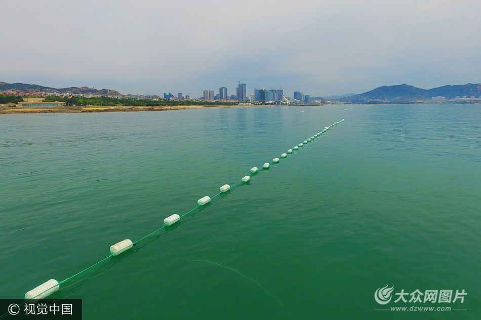 2017年6月12日,青島市石老人海水浴場西部新近鋪設(shè)完成的滸苔攔截網(wǎng)。