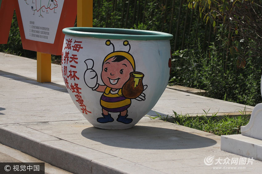 6月18日,日照,在一家農場樂園里,擺放的10多口大缸,畫滿了各類卡通形象,有的還用小蜜蜂做起了廣告。