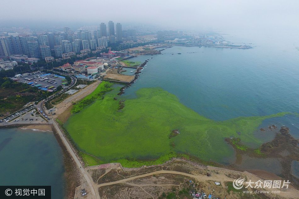 2017年6月20日,受持續南風影響,由東南海域漂來的滸苔開始大面積登陸山東省青島市。在兩天的時間里,滸苔成片漂浮在東部一個海灣內,形成壯觀的“草原”景象。相關部門已調動漁船、裝載機和人力進行清理作業,預計10天內完成全部清運工作。