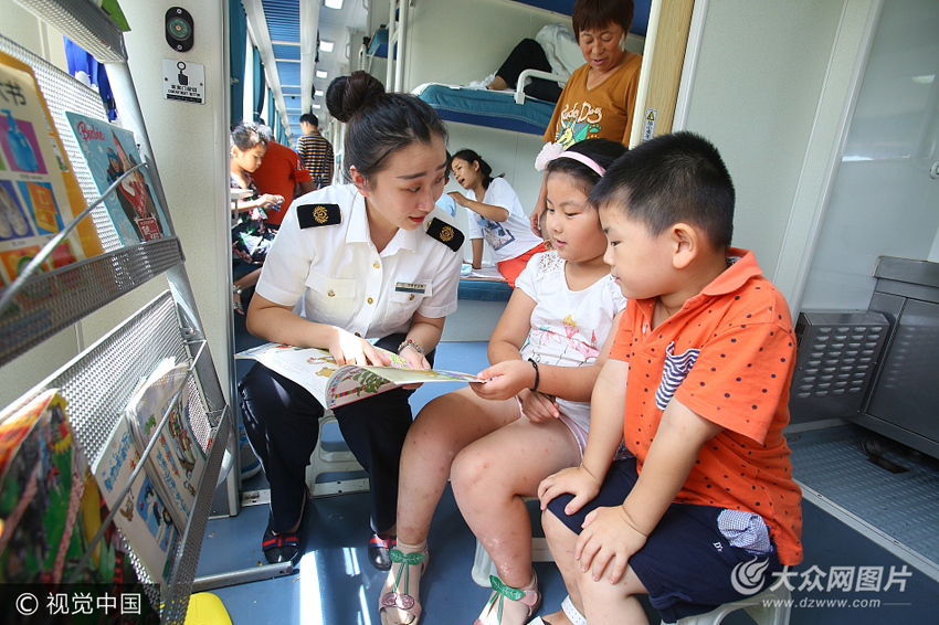7月8日,濟南鐵路局濟南客運段值乘的K1281次列車服務人員在龍川站至東莞東站段間與“小候鳥”一起看書。