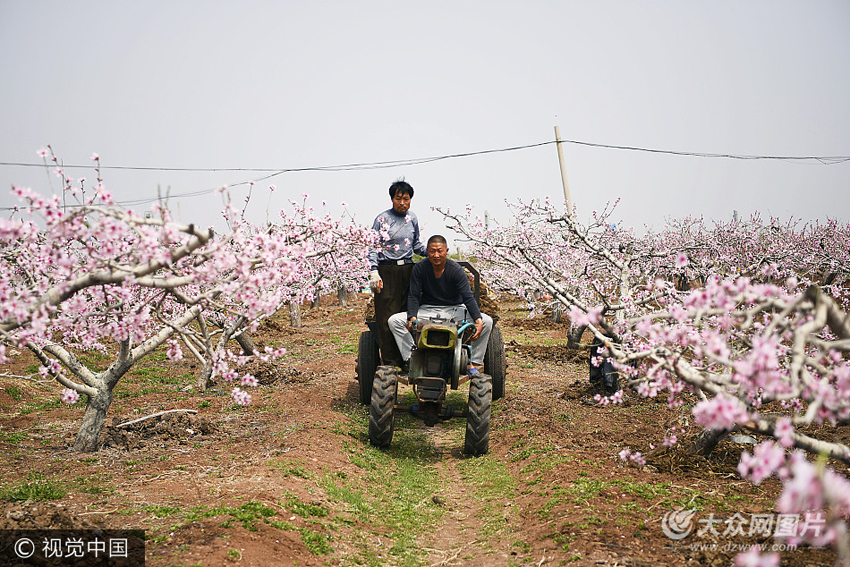 4月7日,日照,莒縣洛河鎮周家莊村,孟憲玉開著手扶拖拉機往桃園運送農家肥。