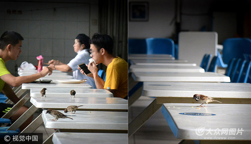 8月10日,青島,在理工大學的一個餐廳,數十名大學生坐在餐桌前吃飯,一群麻雀若無其事地圍在旁邊覓食。